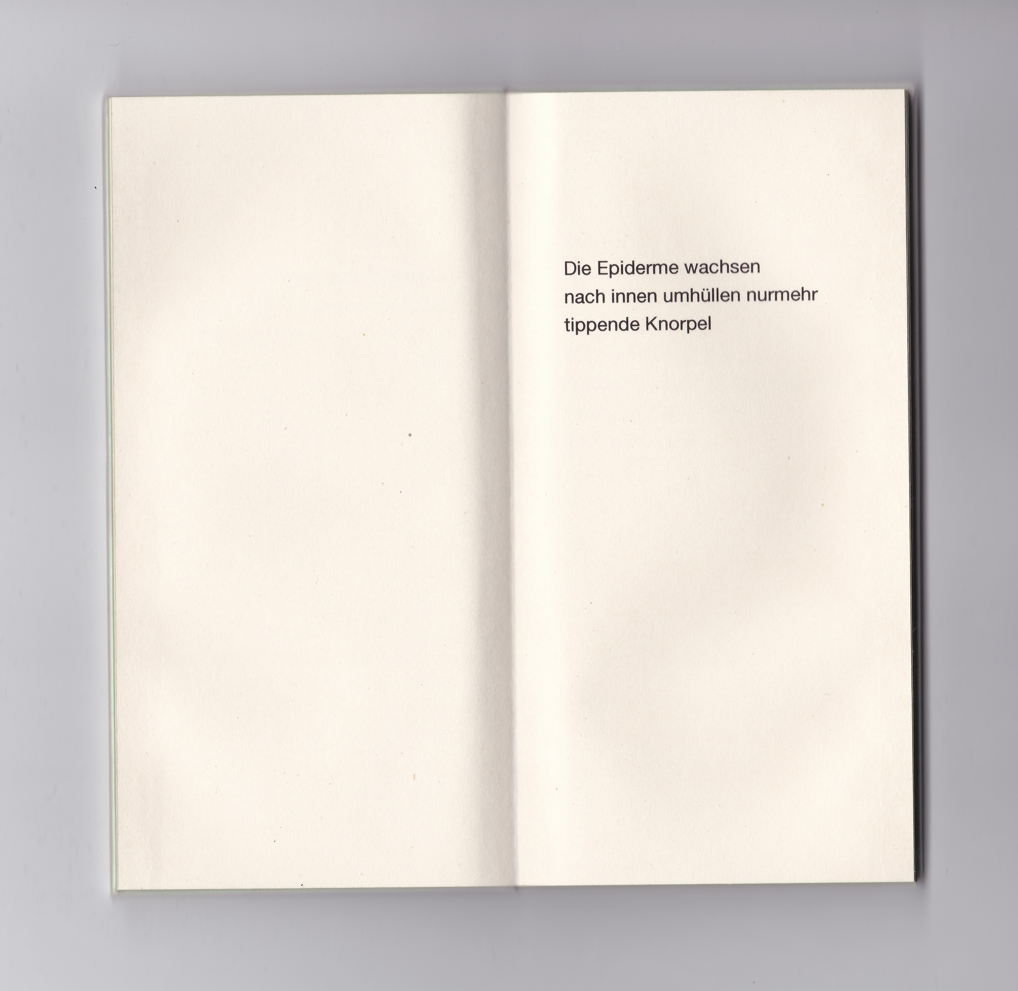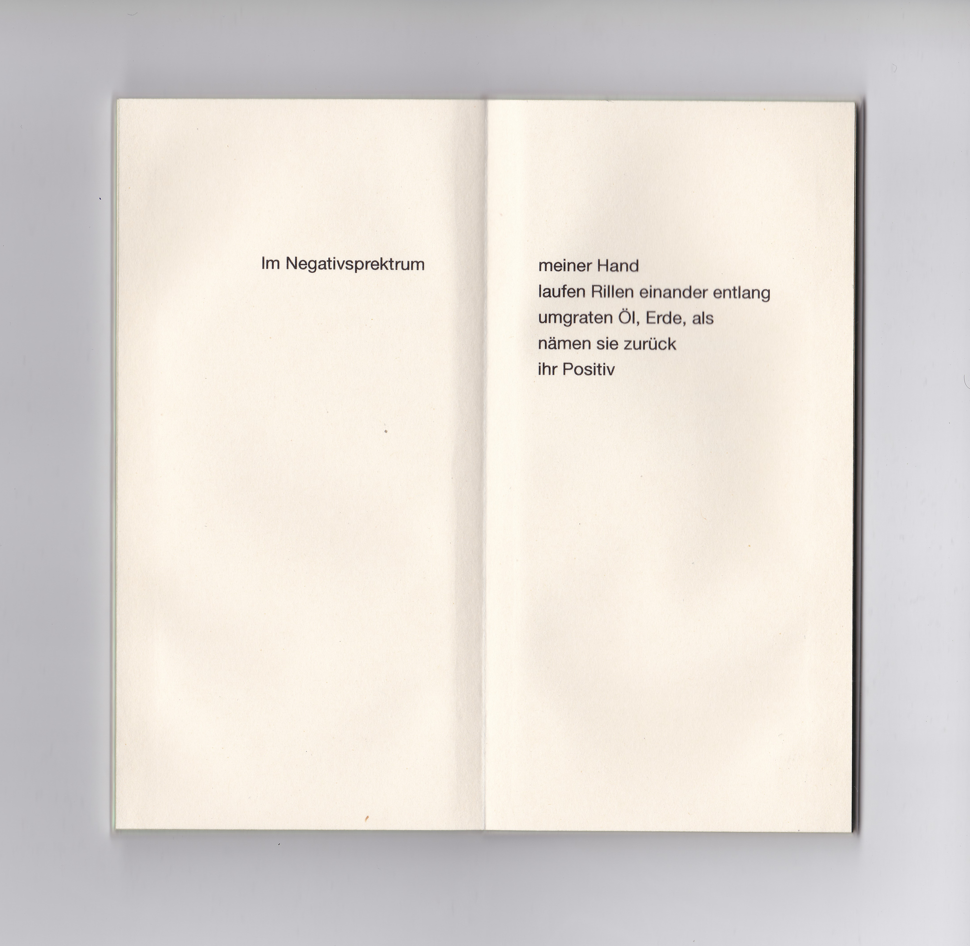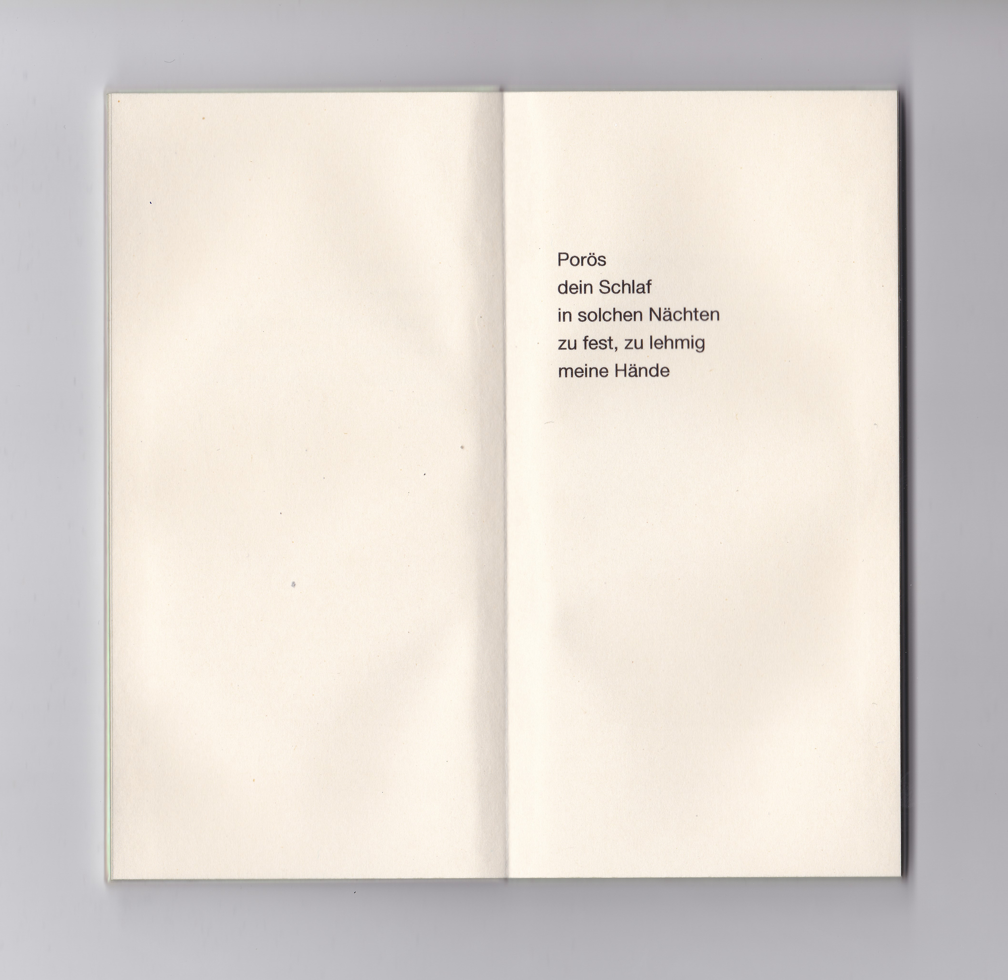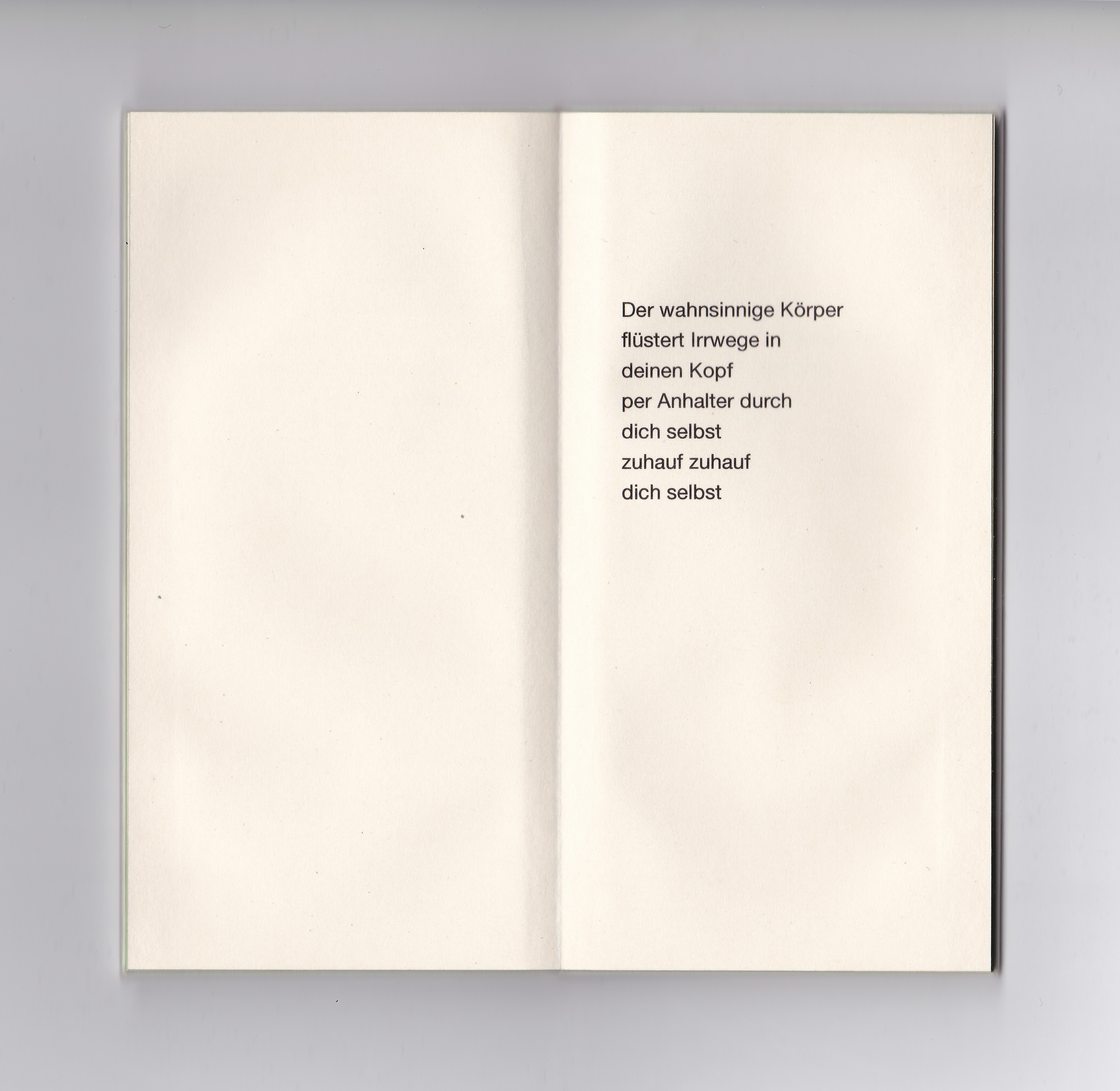Das kleine grünrosa schimmernde Buch, smartphonegroß und genauso schwer, enthält 16 Gedichte. Die kurzen, fragmenthaften Texte reflektieren die Konfrontation mit Digitalität und digitalen Endgeräten. Körperliche Sprache, die das Körpersein selbst ausdrückt, die Sehnsucht nach anderen Körpern statt immer gleich glatten Bildschirmen. Dabei spielt die Form des Buchs selbst mit der Attraktivität von Geräten marktführender Tech-Produzenten: es liegt angenehm schwer in der Hand, ist seidig glatt und um den Titel scharf lesen zu können, muss „hergezoomt“ werden.