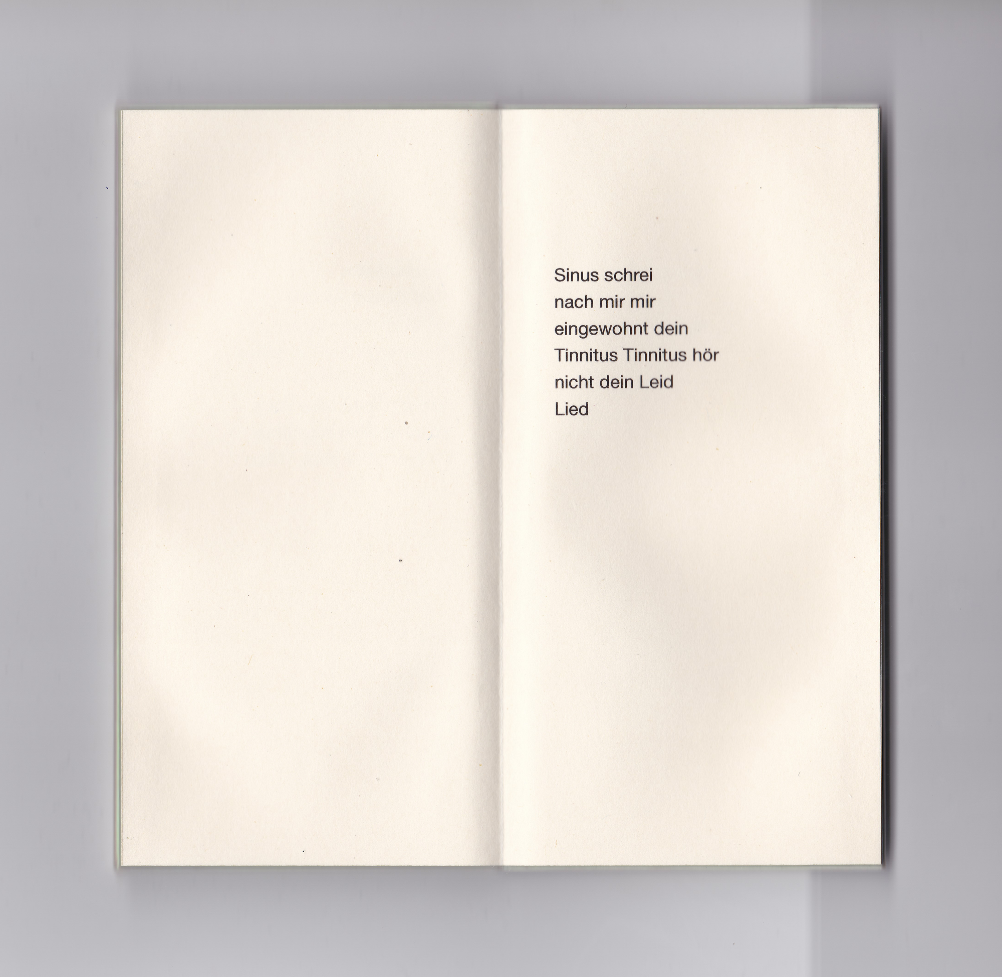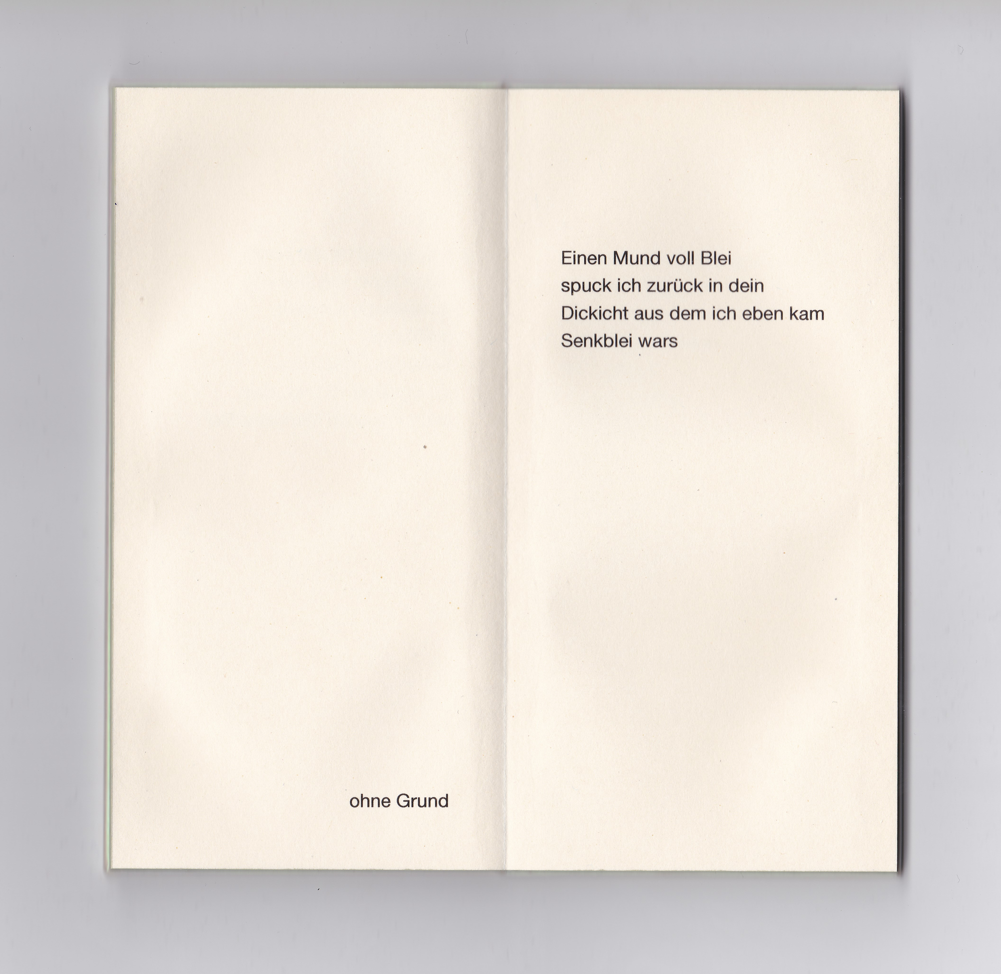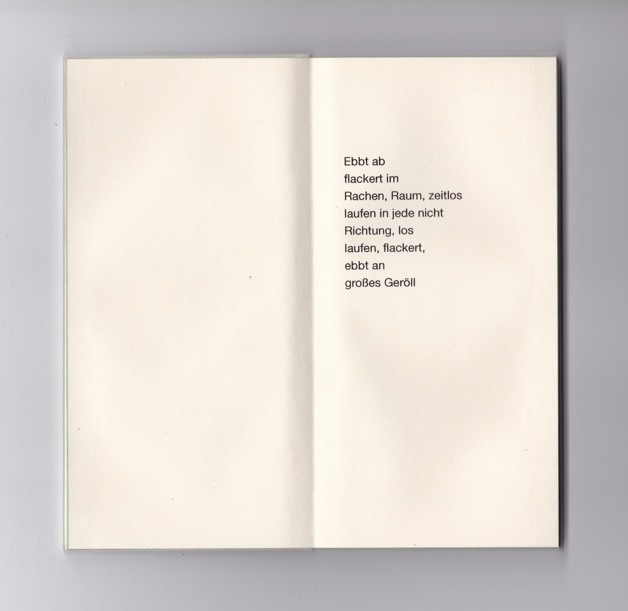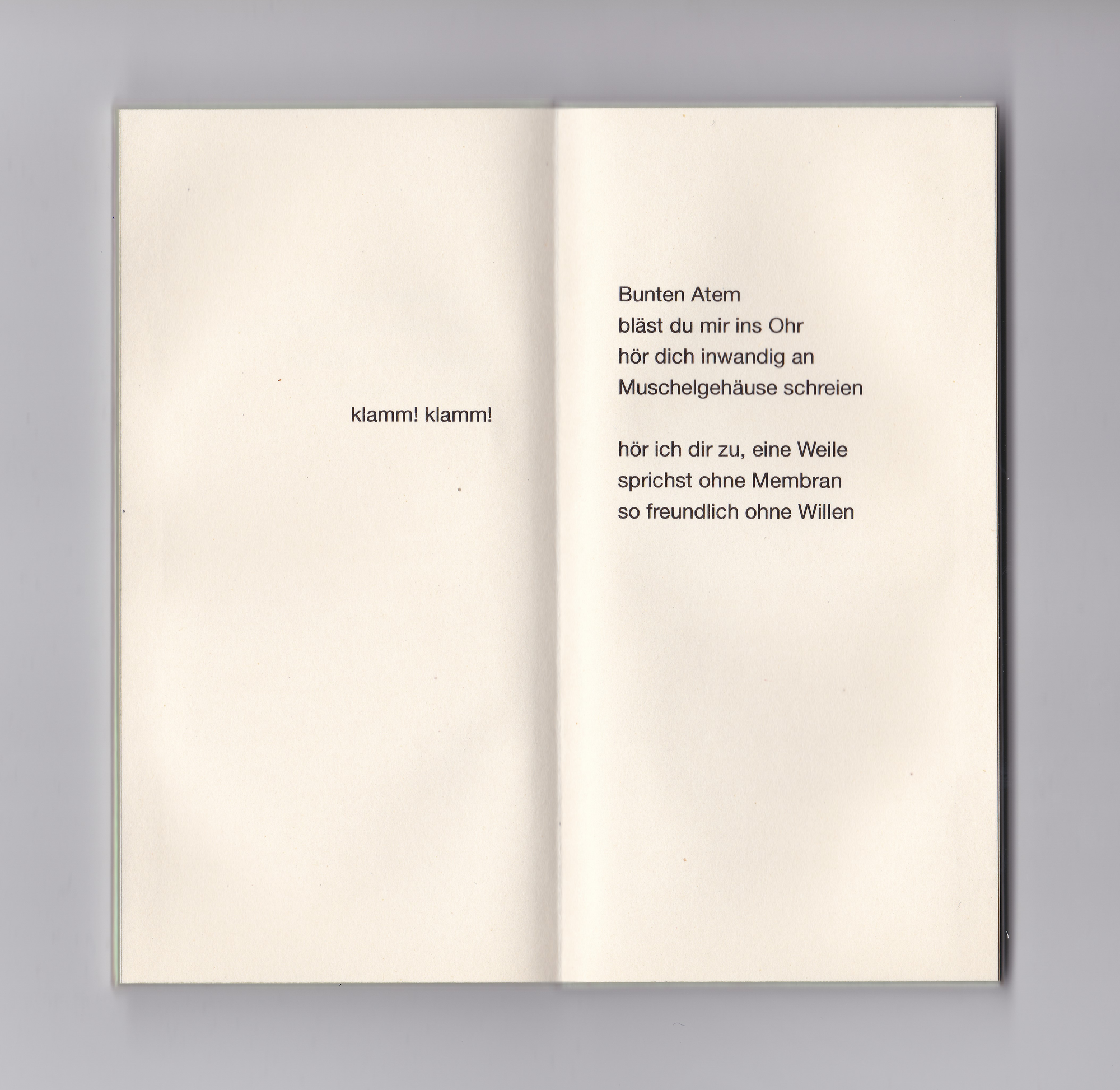 Das kleine grünrosa schimmernde Buch, smartphonegroß und genauso schwer, enthält 16 Gedichte. Die kurzen, fragmenthaften Texte reflektieren die Konfrontation mit Digitalität und digitalen Endgeräten. Körperliche Sprache, die das Körpersein selbst ausdrückt, die Sehnsucht nach anderen Körpern statt immer gleich glatten Bildschirmen. Dabei spielt die Form des Buchs selbst mit der Attraktivität von Geräten marktführender Tech-Produzenten: es liegt angenehm schwer in der Hand, ist seidig glatt und um den Titel scharf lesen zu können, muss „hergezoomt“ werden.
